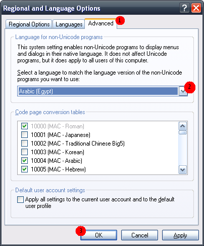 - Select the Advanced tab and then pick up the language you would like to use when dealing with non-Unicode programs that wasn't displaying properly from the list (e.g Arabic) - See a screenshot